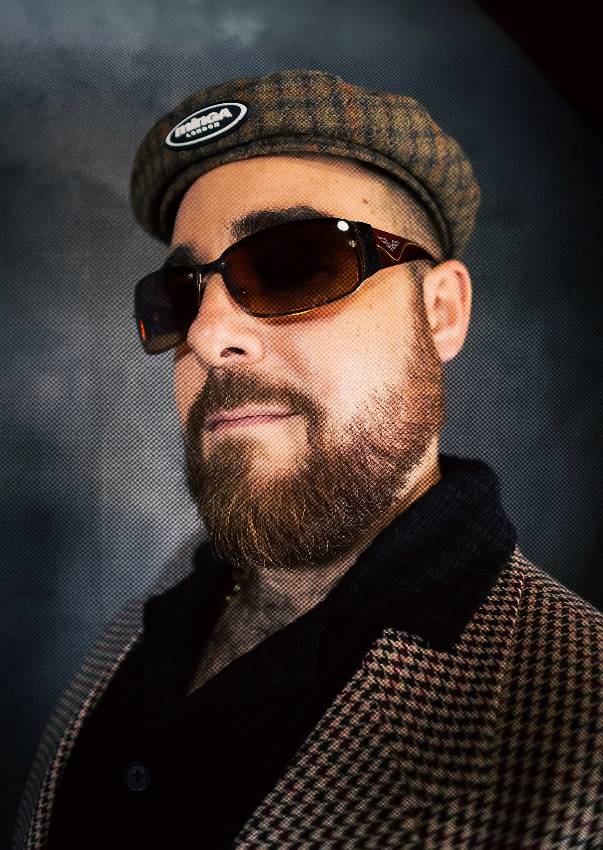 Retrato estilo Y2k, años 2000s, com boina de Minga London, blazer vintage y camisa de Shein man